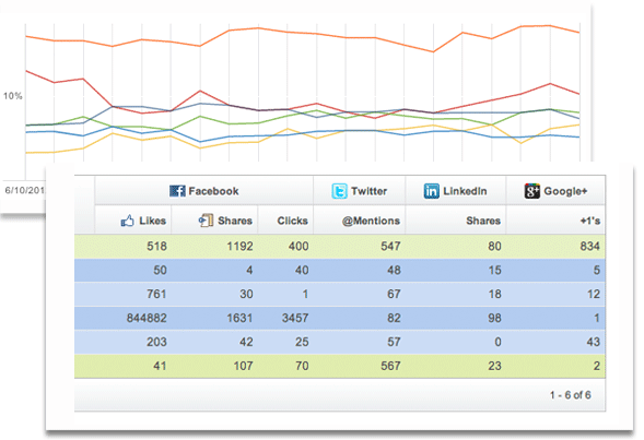 社會化媒體對SEO的影響一直在進化中,重要的社會化媒體信息對于企業(yè)及其競爭對手來說,是SEO戰(zhàn)略的一部分。通過conductor的集成平臺-SEO云,它會針對你和競爭對手的url提供實時的社會化媒體信息。共享SEO和社會化媒體信息,對于企業(yè)來說,是一個關系緊密的線上戰(zhàn)略。Searchlight提供以下社會化媒體信息:Facebook喜歡,Twitter提述,LinkedIn共享及 Google+的點擊。