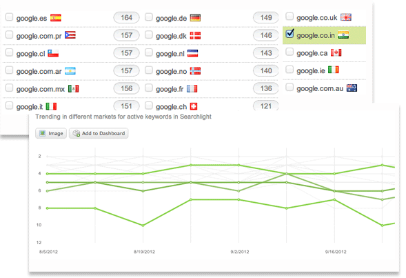 對于企業(yè)品牌、產(chǎn)品及服務來說,國際市場提供了這樣一個新的機會,通過Searchlight,你可以達到實時的國際擴展。Searchlight支持超過30個國際市場和不同語種,所以你可以方便地監(jiān)測全球的視角。跨越國際化搜索引擎,來跟蹤你的搜索引擎性能和排名,以前是從未有過的。通過不同地區(qū)的搜索引擎,創(chuàng)建分類并比較性能,這樣來觀察同樣的關鍵詞是如何在不同區(qū)域的搜索引擎上展示的。